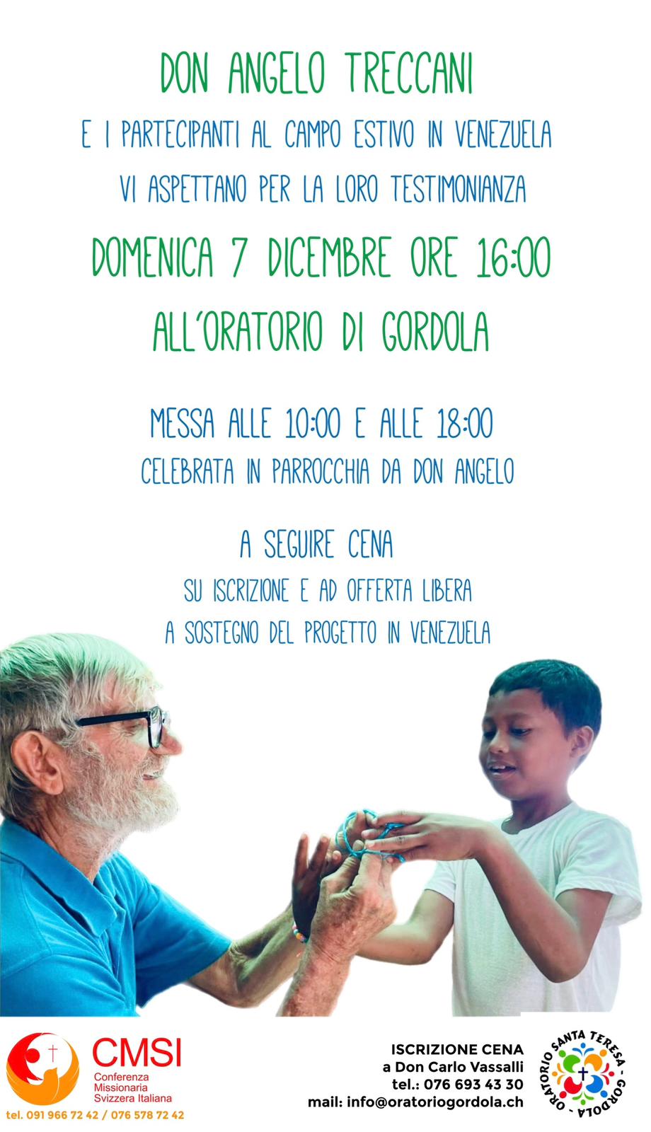Presentazione Campo estivo 2025 & Testimonianza don Angerlo Treccani – 7 dicembre a Gordola Pubblicato giorno 30 Novembre 2025 - CEM Venezuela 2025, In home page, in primo piano, Venezuela Condividi su: Condividi su: